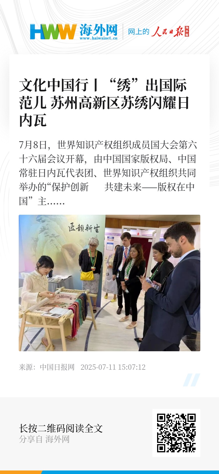 7月8日,世界知识产权组织成员国大会第六十六届会议开幕,由中国国家版权局、中国常驻日内瓦代表团、世界知识产权组织共同举办的“保护创新 共建未来——版权在中国”主题展览,在日内瓦世界知识产权组织总部开展。苏州高新区携苏绣佳作精彩亮相,成为展览现场备受瞩目的焦点。