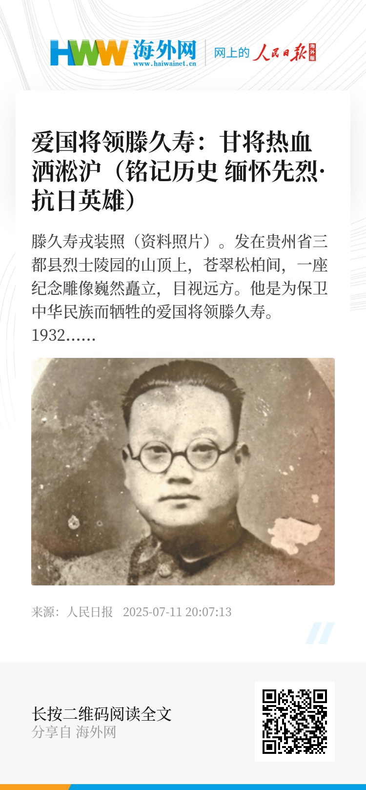 在贵州省三都县烈士陵园的山顶上,苍翠松柏间,一座纪念雕像巍然矗立,目视远方。他是为保卫中华民族而牺牲的爱国将领滕久寿。1932年,日本侵略军进攻上海,在淞沪抗战中,他在牺牲前的最后一刻发出指令:“我辈军人,负有保国卫民之责,速还炮杀敌,后退者枪毙!”