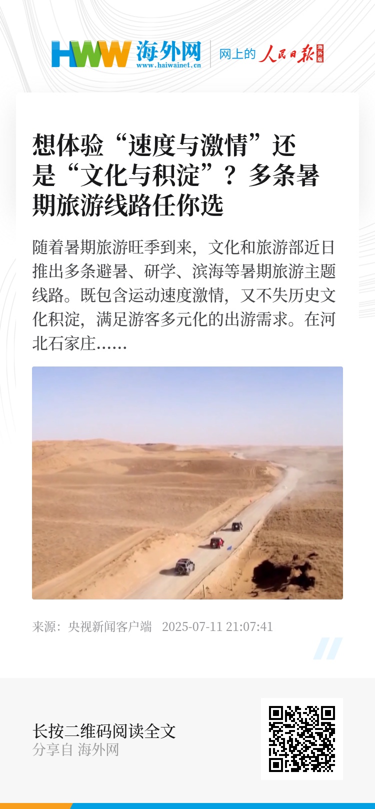随着暑期旅游旺季到来,文化和旅游部近日推出多条避暑、研学、滨海等暑期旅游主题线路。既包含运动速度激情,又不失历史文化积淀,满足游客多元化的出游需求。