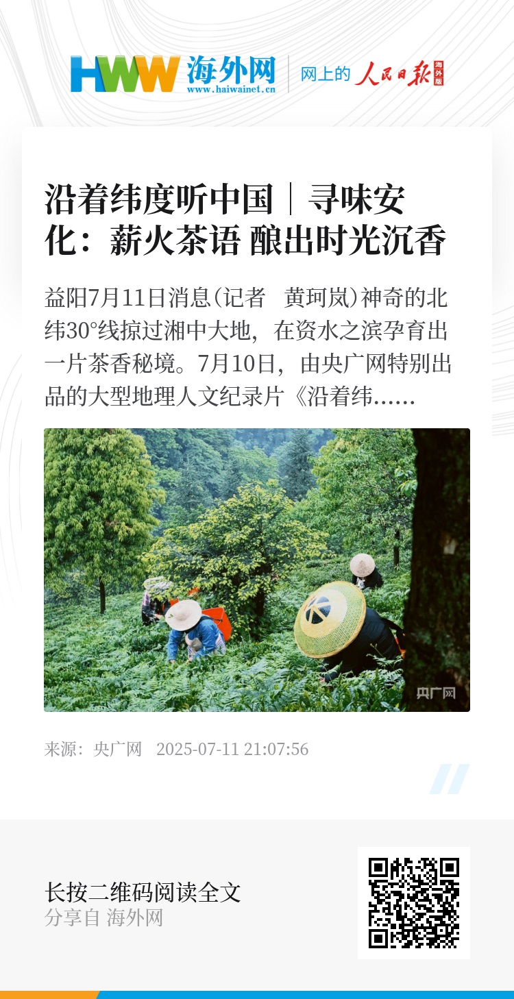当《沿着纬度听中国》的镜头掠过安化的青山秀水,渥堆车间里弥漫着温润的发酵气息,古老的七星灶升腾起袅袅松烟,茶农在茶园与车间忙碌的身影清晰可见。这片土地上的每一片茶叶,都浸润着山水的精华与时光的沉淀;每一盏醇厚的茶汤,都诉说着千年的技艺传承与不息的创新活力。安化黑茶,正从历史深处走来,带着山的厚重、水的灵韵、火的淬炼与时光的馈赠,成为中国茶文化宝库中一颗独特而璀璨的明珠。