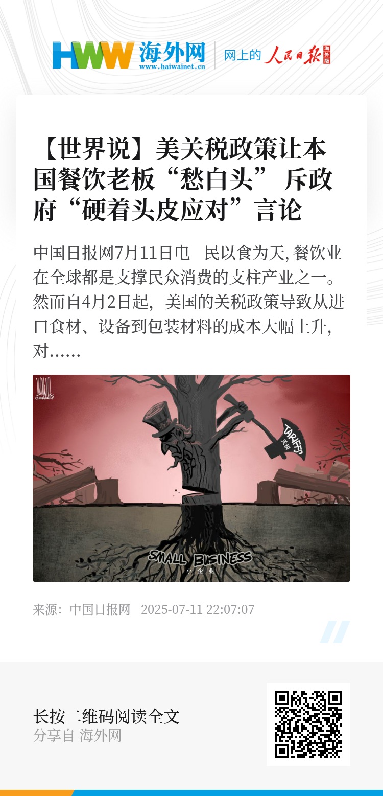 中国日报网7月11日电 民以食为天,餐饮业在全球都是支撑民众消费的支柱产业之一。然而自4月2日起,美国的关税政策导致从进口食材、设备到包装材料的成本大幅上升,对本国餐饮业造成了显著冲击。
