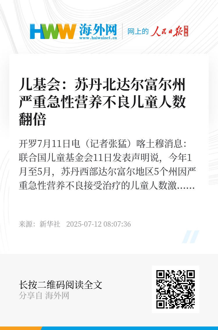 新华社开罗7月11日电(记者张猛)喀土穆消息:联合国儿童基金会11日发表声明说,今年1月至5月,苏丹西部达尔富尔地区5个州因严重急性营养不良接受治疗的儿童人数激增,其中仅北达尔富尔州就有4万多名儿童接受治疗,是去年同期的两倍。