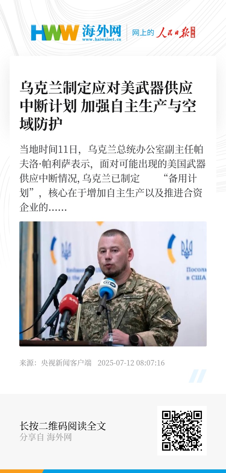 当地时间11日,乌克兰总统办公室副主任帕夫洛·帕利萨表示,面对可能出现的美国武器供应中断情况,乌克兰已制定 “备用计划”,核心在于增加自主生产以及推进合资企业的发展。同时,乌克兰正全力投入空域保护工作,并积极开发新的技术解决方案,以应对各类威胁。(总台记者 董薇)