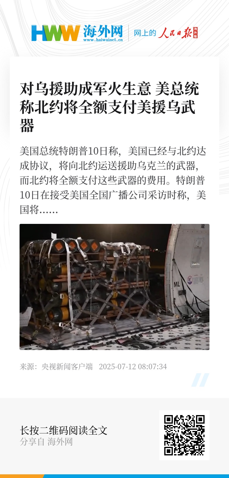 美国总统特朗普10日称,美国已经与北约达成协议,将向北约运送援助乌克兰的武器,而北约将全额支付这些武器的费用。