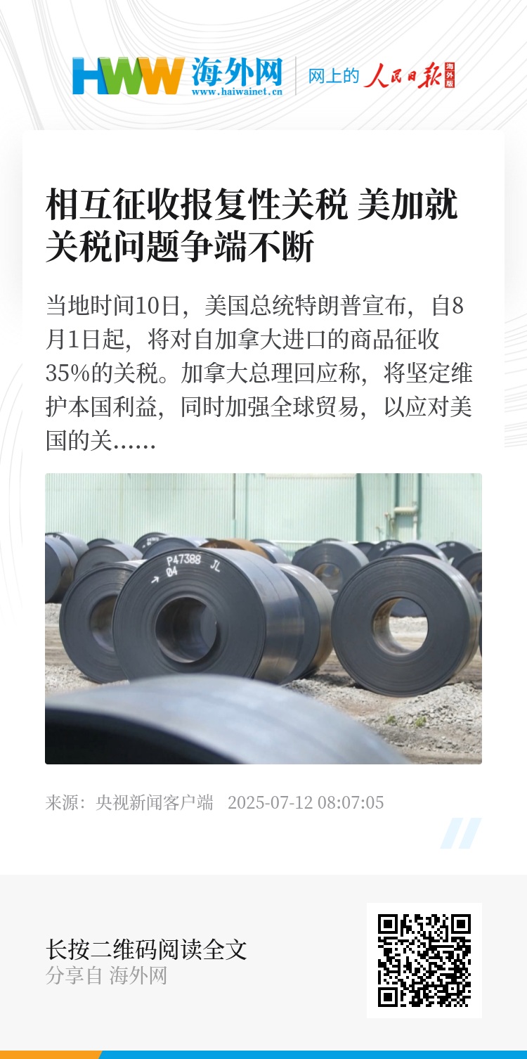 当地时间10日,美国总统特朗普宣布,自8月1日起,将对自加拿大进口的商品征收35%的关税。加拿大总理回应称,将坚定维护本国利益,同时加强全球贸易,以应对美国的关税威胁。