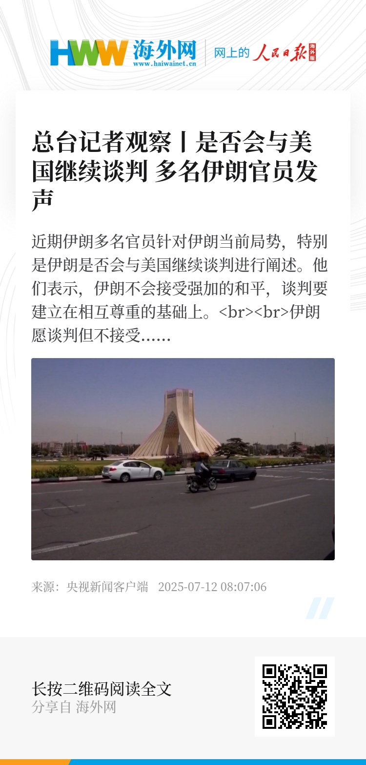 总台记者 李健南:当地时间10日,伊朗议会议长卡利巴夫指出,从过去到现在,伊朗与美国进行的所有谈判都在围绕三个核心问题展开,即是否研发核武器、伊朗导弹问题以及伊朗的地区影响力。伊朗在核问题框架下与美国进行谈判,并始终强调伊朗是《不扩散核武器条约》成员国。伊朗从未寻求发展核武器,现在也不会,但伊朗认为铀浓缩是伊朗不可剥夺的权利。对于今后是否应与美国进行谈判,卡利巴夫指出,在第六轮伊朗美国核问题谈判前,以色列在美国的支持和默许下袭击了伊朗。尽管如此伊朗认为,即便不信任对方,但外交本身就是一种斗争手段,只要有谈判,就会拥有发言权。但他强调,正如伊朗不接受强加的战争一样,伊朗也不会接受强加的和平。美国认为只要伊朗参与谈判,他们就会占据主动,但伊朗不接受美国的单边主义行径。