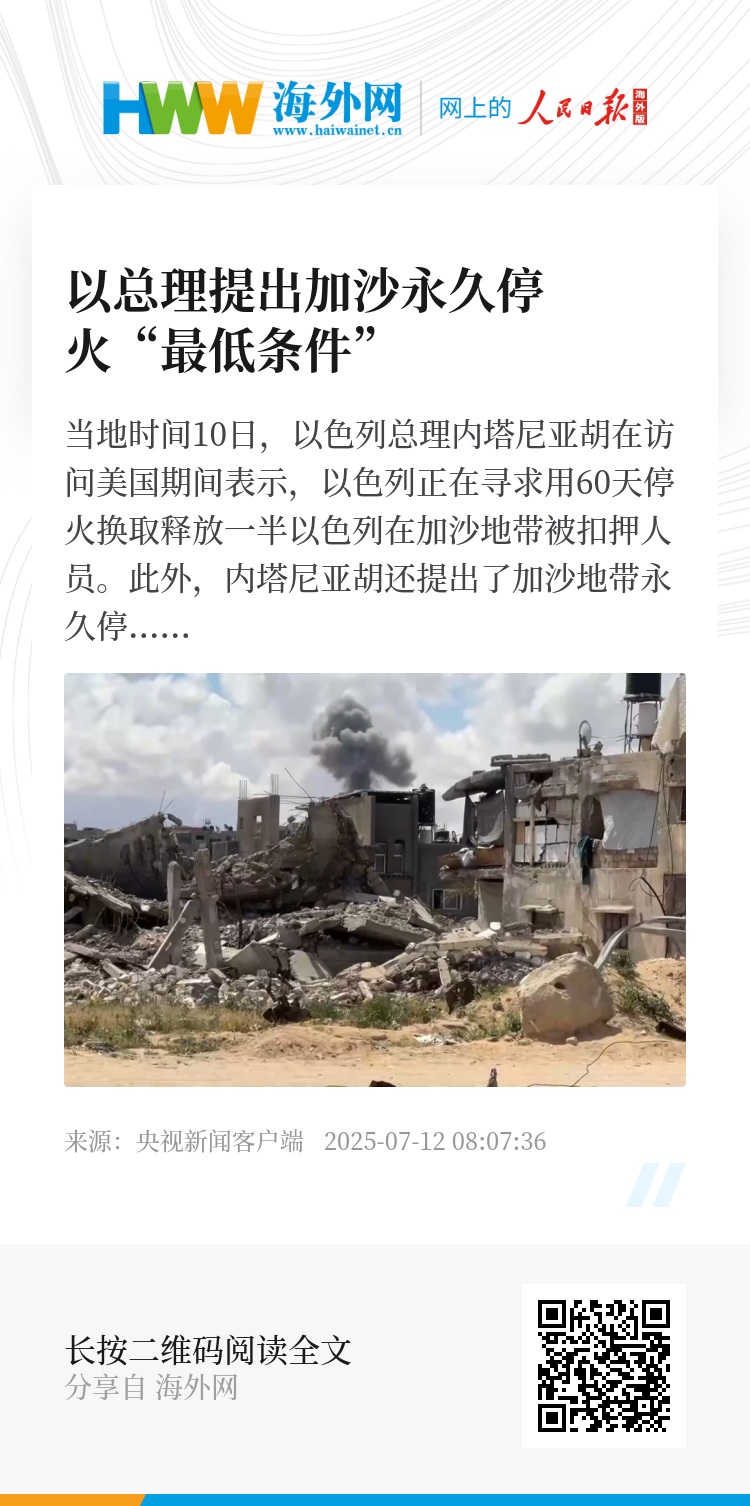 当地时间10日,以色列总理内塔尼亚胡在访问美国期间表示,以色列正在寻求用60天停火换取释放一半以色列在加沙地带被扣押人员。此外,内塔尼亚胡还提出了加沙地带永久停火的“最低条件”。同一天,以媒援引巴勒斯坦消息人士的话称,哈马斯对以色列此前提交的停火期间以军部署方案感到不满。