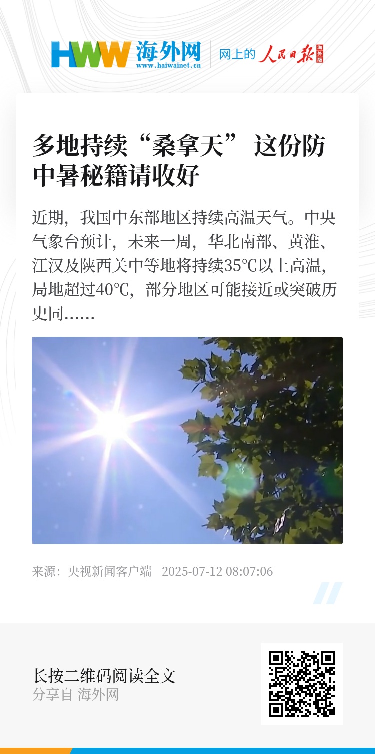 近期,我国中东部地区持续高温天气。中央气象台预计,未来一周,华北南部、黄淮、江汉及陕西关中等地将持续35℃以上高温,局地超过40℃,部分地区可能接近或突破历史同期极值。此外,下周起,四川盆地、江淮、江南北部等地也将出现阶段性高温天气。