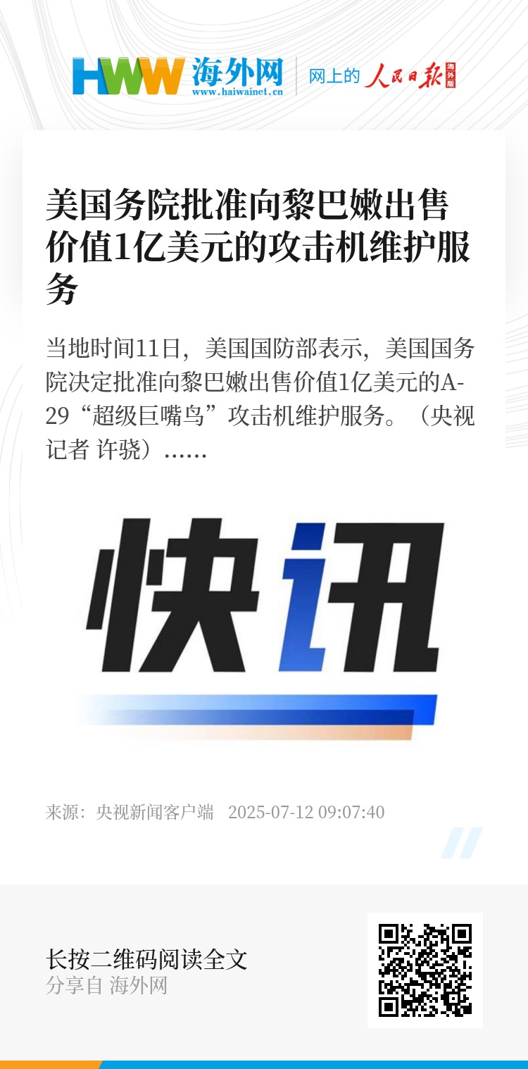 当地时间11日,美国国防部表示,美国国务院决定批准向黎巴嫩出售价值1亿美元的A-29“超级巨嘴鸟”攻击机维护服务。(央视记者 许骁)