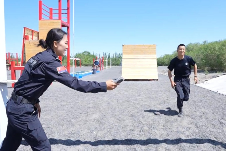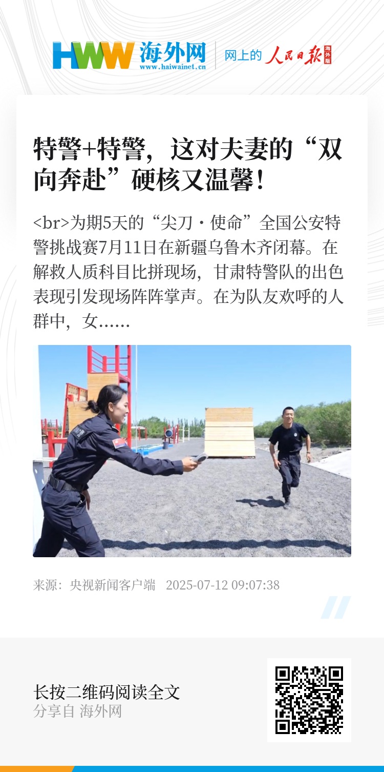 为期5天的“尖刀・使命”全国公安特警挑战赛7月11日在新疆乌鲁木齐闭幕。在解救人质科目比拼现场,甘肃特警队的出色表现引发现场阵阵掌声。在为队友欢呼的人群中,女警张文娟的目光始终追随着赛场中那个熟悉的身影——她的丈夫,同时也是此次参赛的突击队员刘亮。这对从师徒走到并肩征战全国赛场的特警“夫妻档”,背后藏着怎样的热血故事?