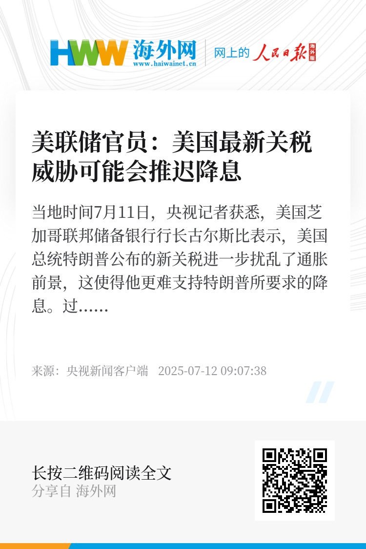 当地时间7月11日,央视记者获悉,美国芝加哥联邦储备银行行长古尔斯比表示,美国总统特朗普公布的新关税进一步扰乱了通胀前景,这使得他更难支持特朗普所要求的降息。