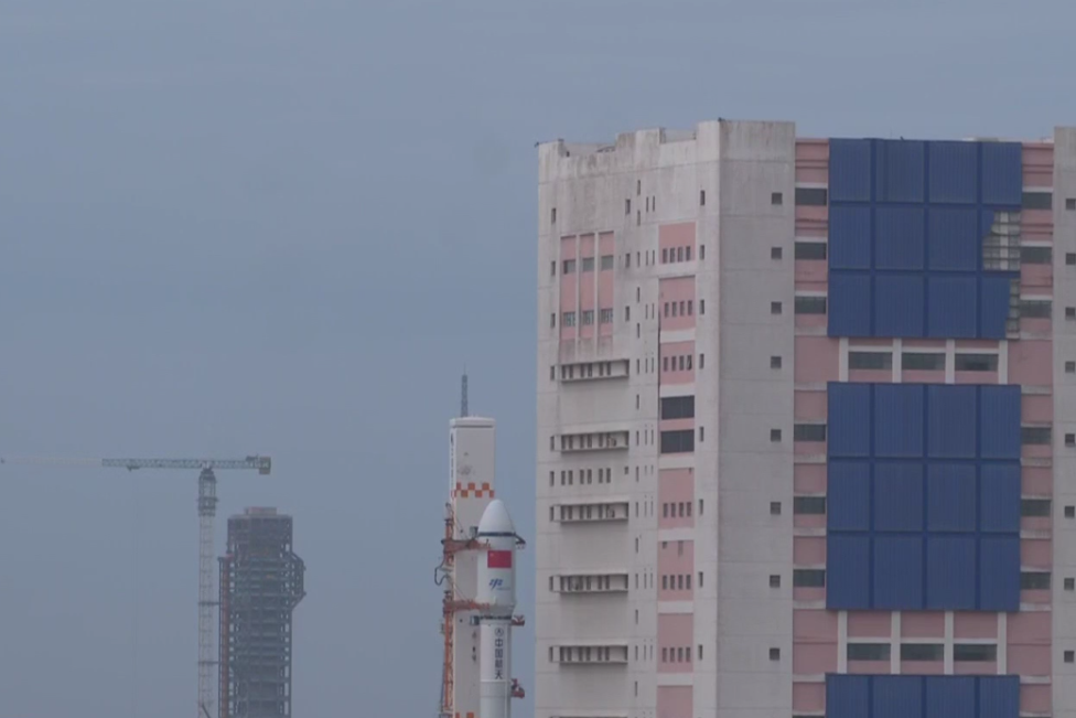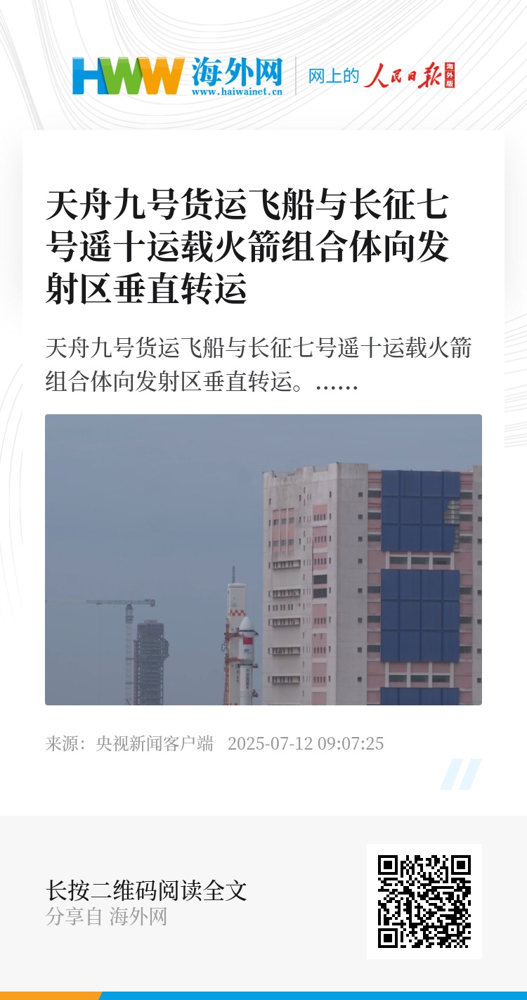 天舟九号货运飞船与长征七号遥十运载火箭组合体向发射区垂直转运。