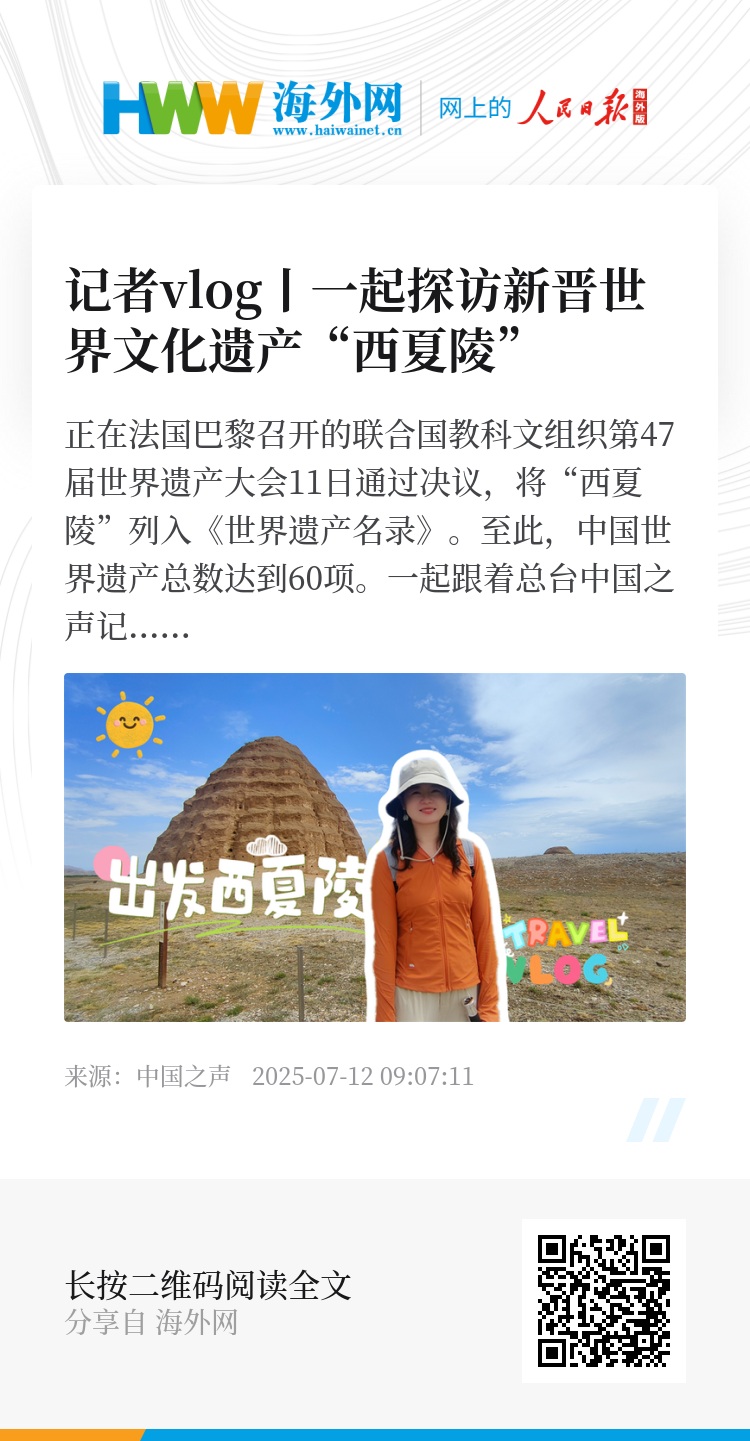 正在法国巴黎召开的联合国教科文组织第47届世界遗产大会11日通过决议,将“西夏陵”列入《世界遗产名录》。至此,中国世界遗产总数达到60项。一起跟着总台中国之声记者丁飞去宁夏银川探访新晋世界文化遗产“西夏陵”吧!