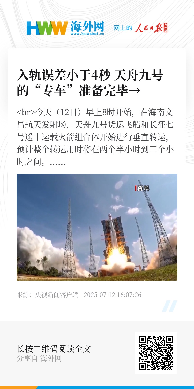 今天(12日)早上8时开始,在海南文昌航天发射场,天舟九号货运飞船和长征七号遥十运载火箭组合体开始进行垂直转运,预计整个转运用时将在两个半小时到三个小时之间。