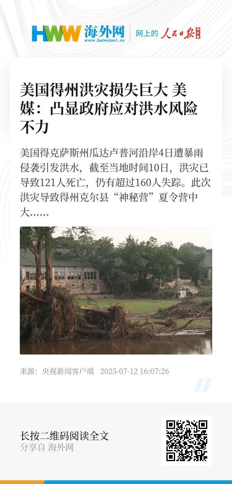 此次洪灾导致得州克尔县“神秘营”夏令营中大量儿童死亡,多人失踪。美国有线电视新闻网11日报道称,该夏令营发生的悲剧凸显了当地政府应对洪水风险不力。