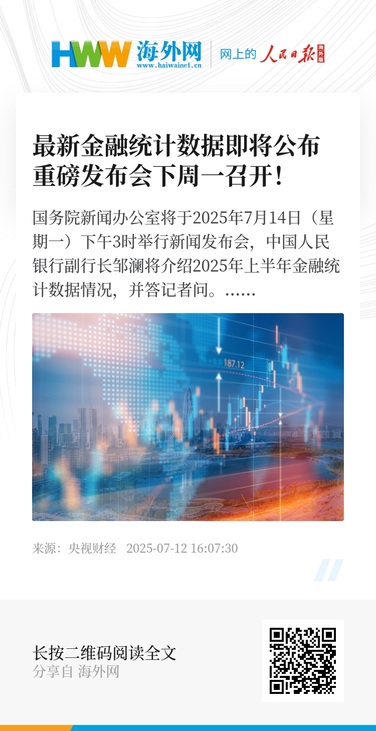 国务院新闻办公室将于2025年7月14日(星期一)下午3时举行新闻发布会,中国人民银行副行长邹澜将介绍2025年上半年金融统计数据情况,并答记者问。