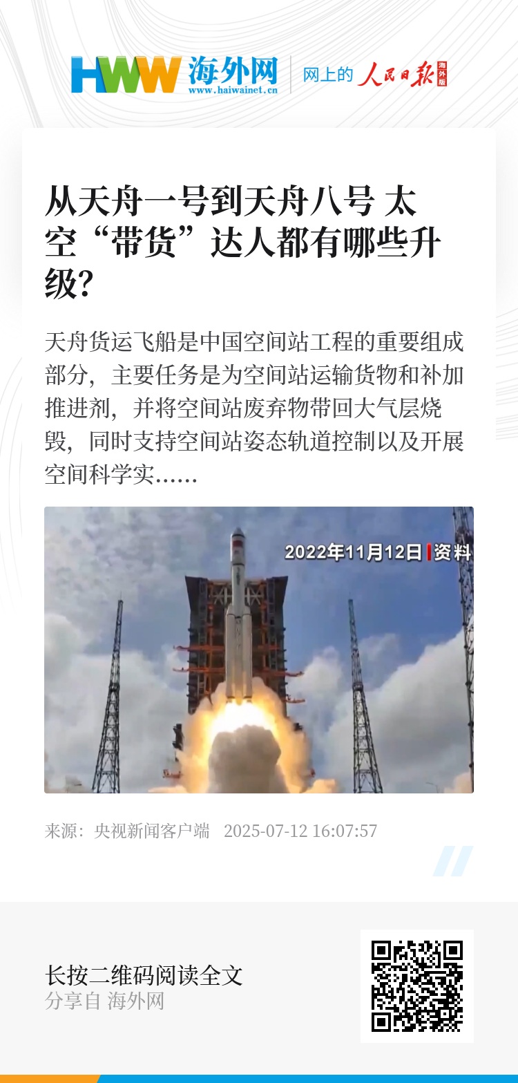 天舟货运飞船是中国空间站工程的重要组成部分,主要任务是为空间站运输货物和补加推进剂,并将空间站废弃物带回大气层烧毁,同时支持空间站姿态轨道控制以及开展空间科学实验和试验。自2017年天舟一号首飞以来,该系列飞船运输能力不断突破,为空间站物资补给和科学实验提供了更加高效、灵活的保障。