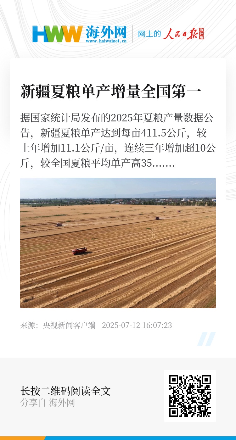 据国家统计局发布的2025年夏粮产量数据公告,新疆夏粮单产达到每亩411.5公斤,较上年增加11.1公斤/亩,连续三年增加超10公斤,较全国夏粮平均单产高35.9公斤/亩,增量全国第一。由于新疆部分地区春小麦成熟较晚,预测产量达684万吨。