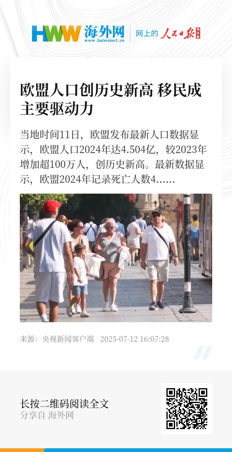 当地时间11日,欧盟发布最新人口数据显示,欧盟人口2024年达4.504亿,较2023年增加超100万人,创历史新高。
