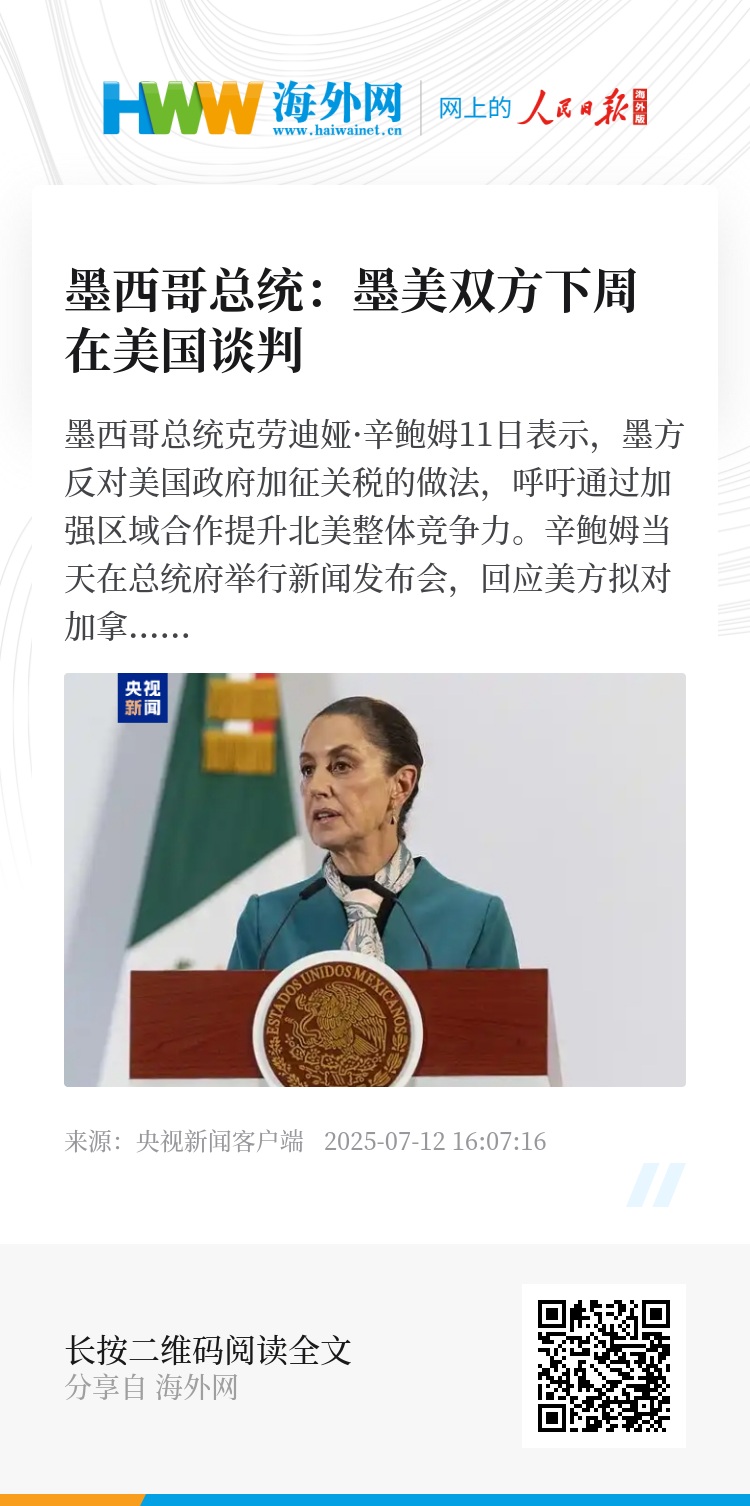 辛鲍姆还表示,墨美双方将于下周在美国举行谈判。目前,由墨西哥经济部长马塞洛·埃布拉德率领的墨方代表团已抵达华盛顿,本次谈判将围绕安全、移民和贸易合作三项议题展开。