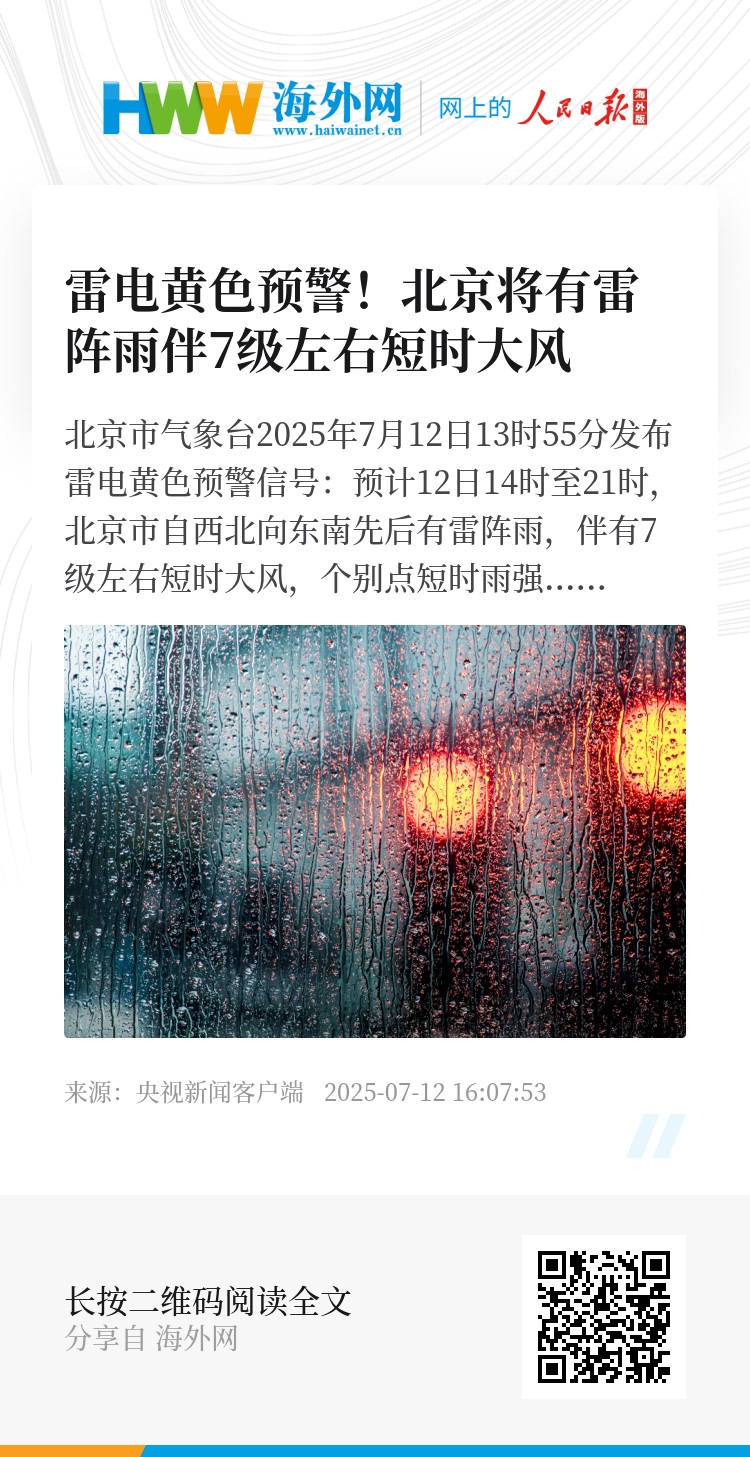 北京市气象台2025年7月12日13时55分发布雷电黄色预警信号:预计12日14时至21时,北京市自西北向东南先后有雷阵雨,伴有7级左右短时大风,个别点短时雨强较大并有小冰雹,请注意防范。