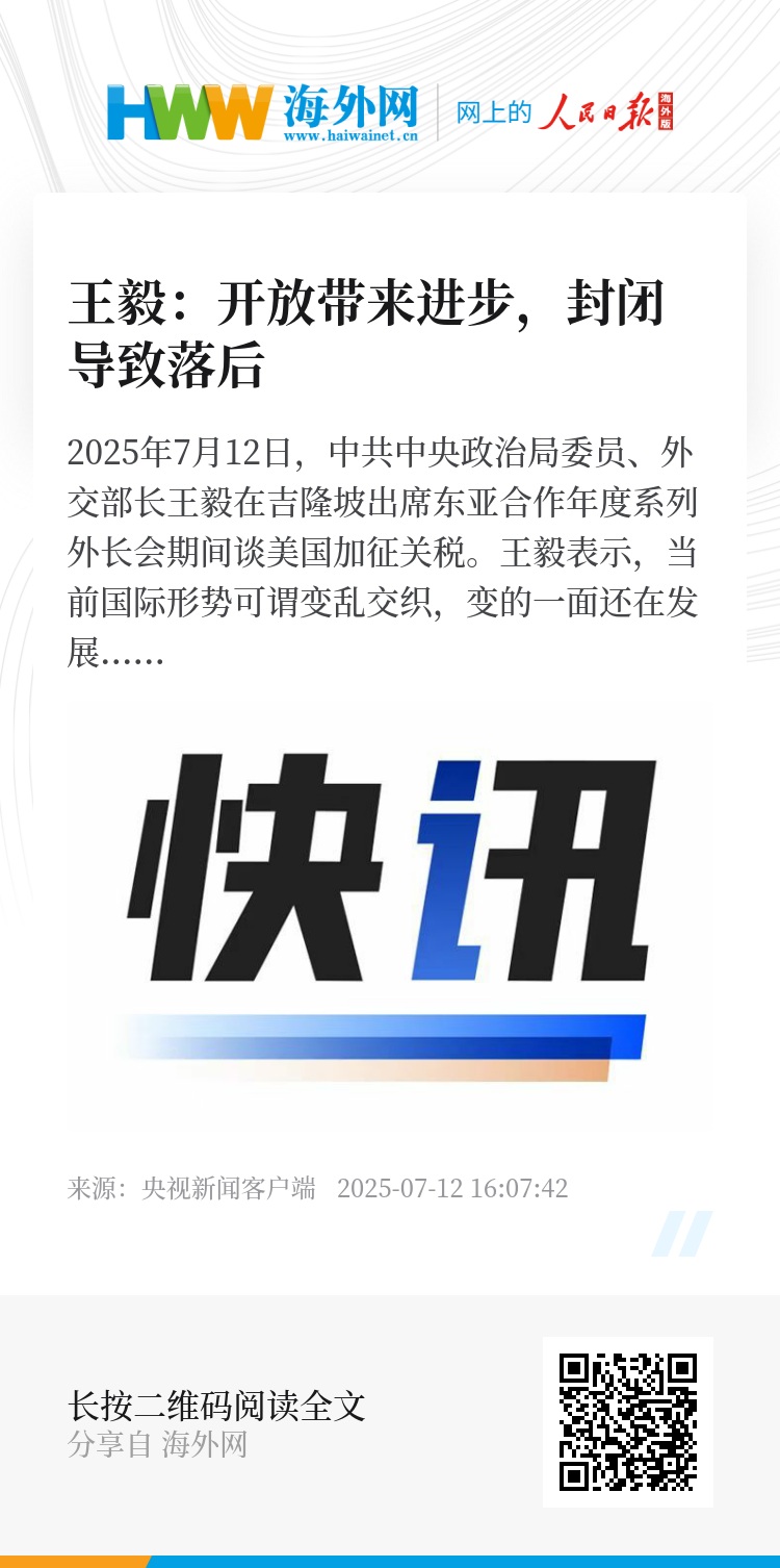 2025年7月12日,中共中央政治局委员、外交部长王毅在吉隆坡出席东亚合作年度系列外长会期间谈美国加征关税。
