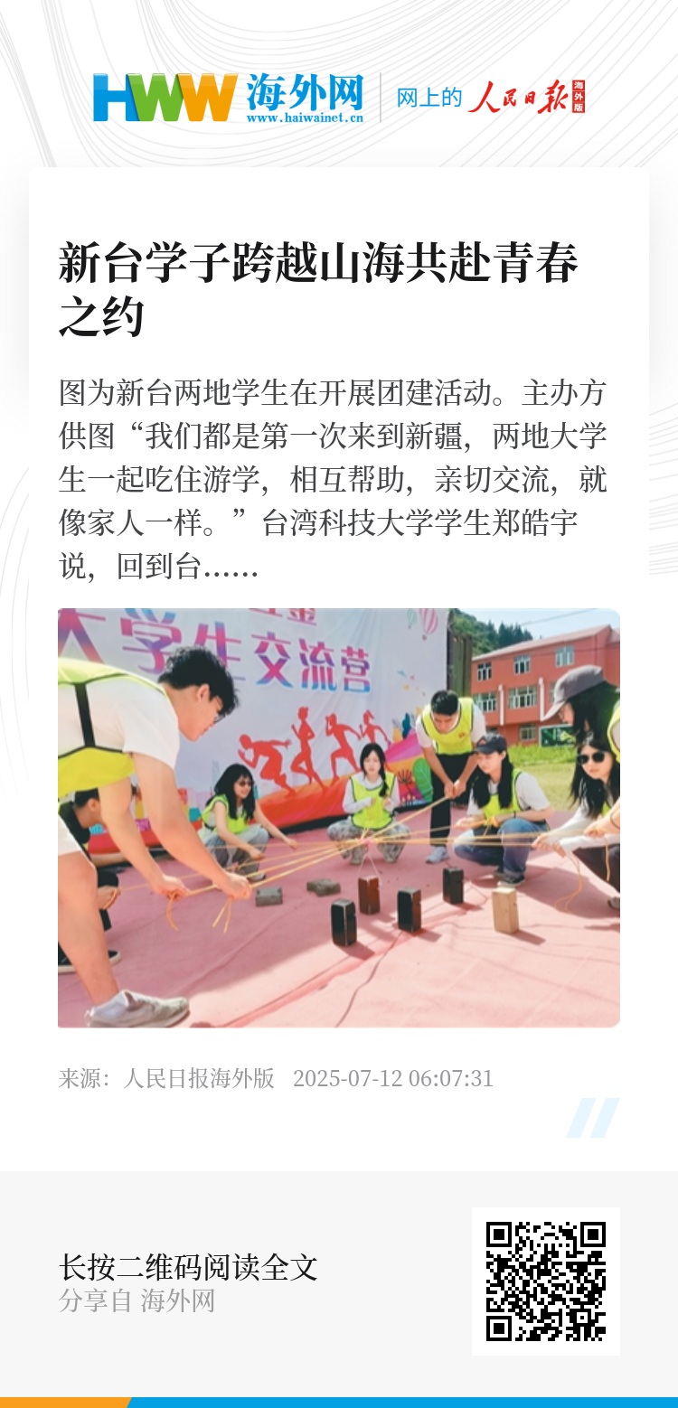 近日,“一路新疆·互学互鉴”——新台两地大学生交流营在新疆维吾尔自治区举办。为期10天的活动中,来自台湾17所高校的24名大学生与新疆师范大学8名大学生共赴青春之约,在开展团建、走访高校、探寻非遗等多样化形式中深入交流、互学互鉴,感受丝路文化魅力。