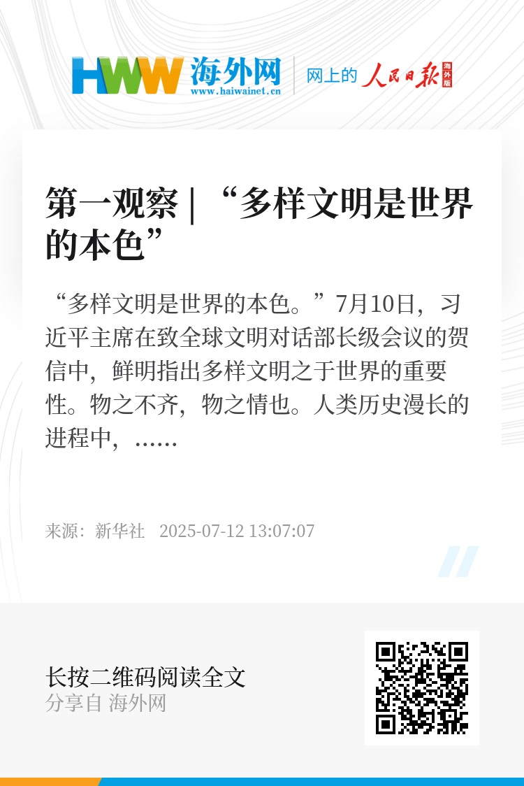 “多样文明是世界的本色。”7月10日,习近平主席在致全球文明对话部长级会议的贺信中,鲜明指出多样文明之于世界的重要性。