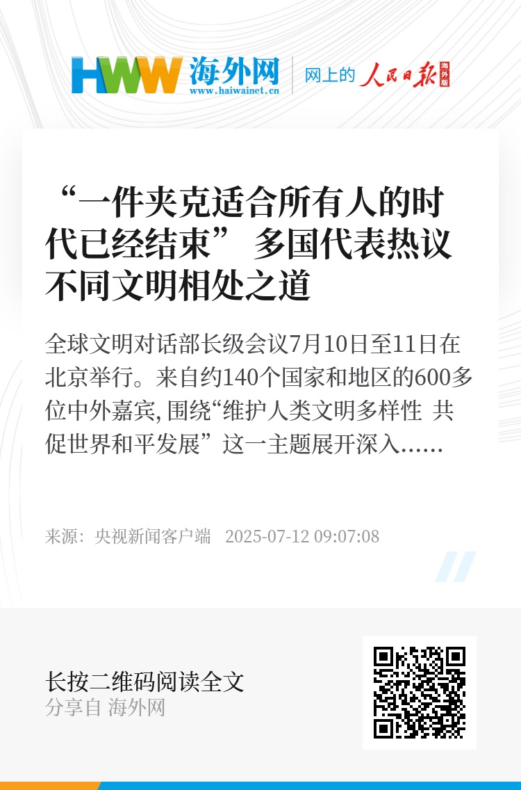 全球文明对话部长级会议7月10日至11日在北京举行。来自约140个国家和地区的600多位中外嘉宾,围绕“维护人类文明多样性 共促世界和平发展”这一主题展开深入交流。多位外国嘉宾在接受总台环球资讯广播记者采访时表示,不同文明间应当彼此尊重、交流互鉴。
