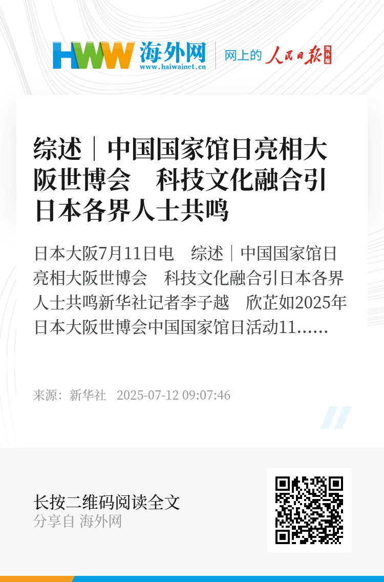 新华社日本大阪7月11日电 综述|中国国家馆日亮相大阪世博会 科技文化融合引日本各界人士共鸣