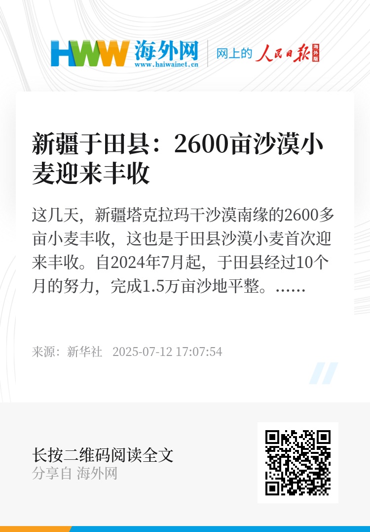 这几天,新疆塔克拉玛干沙漠南缘的2600多亩小麦丰收,这也是于田县沙漠小麦首次迎来丰收。