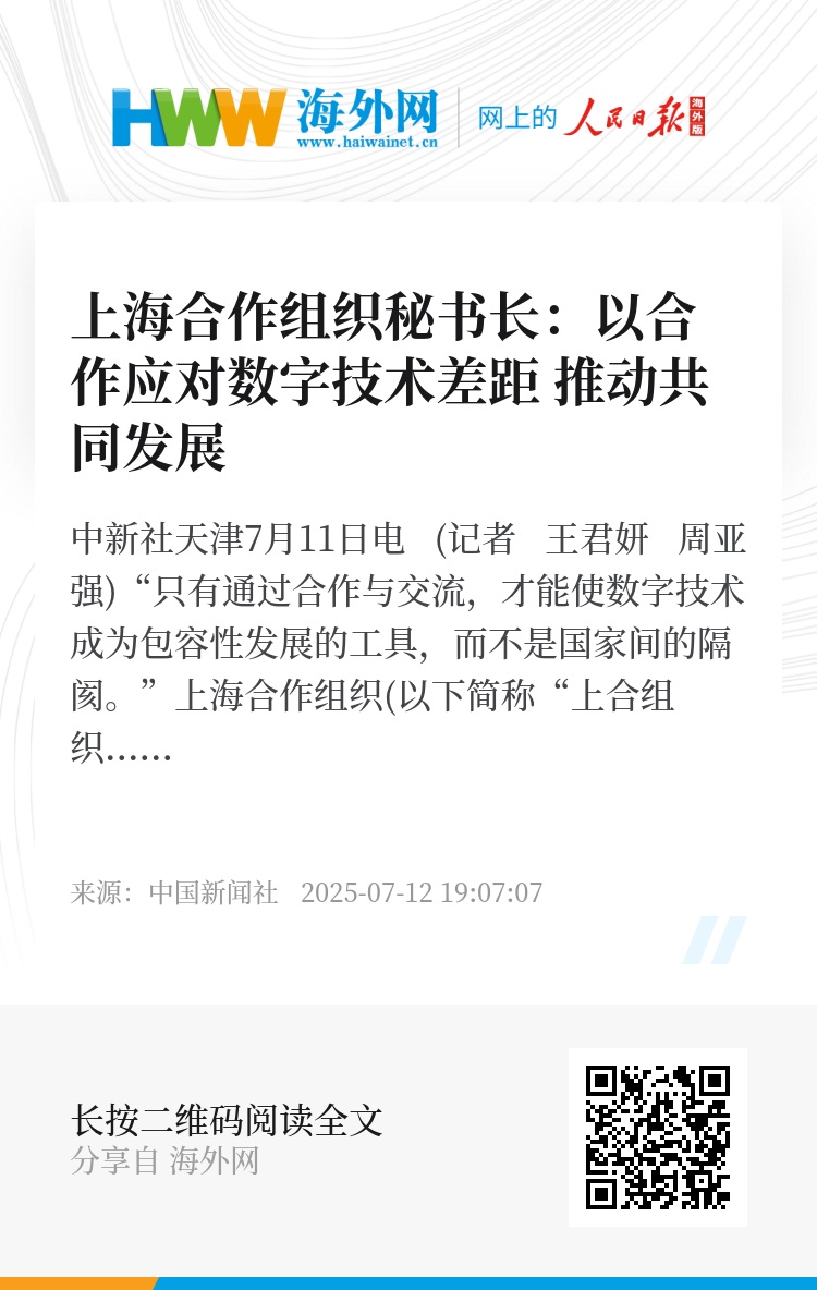 中新社天津7月11日电 (记者 王君妍 周亚强)“只有通过合作与交流,才能使数字技术成为包容性发展的工具,而不是国家间的隔阂。”上海合作组织(以下简称“上合组织”)秘书长叶尔梅克巴耶夫11日在天津表示。