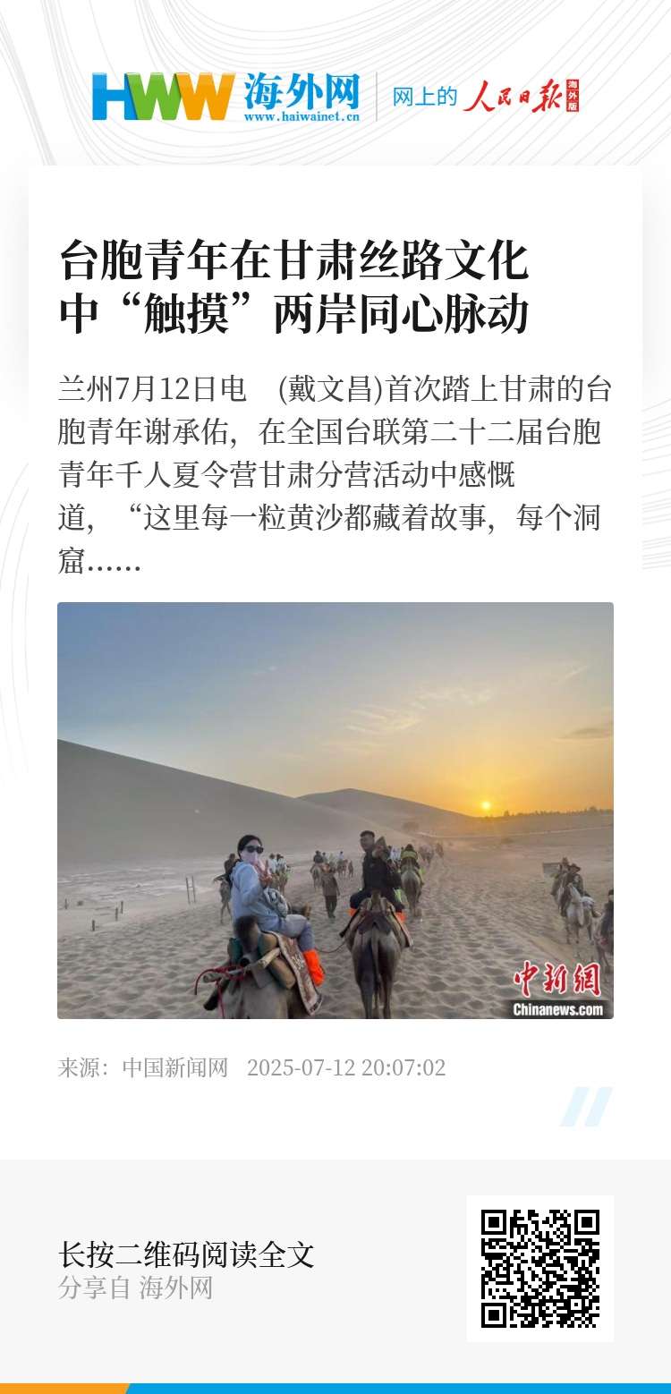 谈及此行最大收获,谢承佑指向同行的两岸伙伴,骑骆驼时大家手拉手防止摔倒,看鸣沙山万人星空演唱时一起为精彩唱段鼓掌,“这些瞬间让我明白,两岸青年交往无需刻意设计话题,只要敞开心扉,就能在共同体验中收获真挚情谊。”