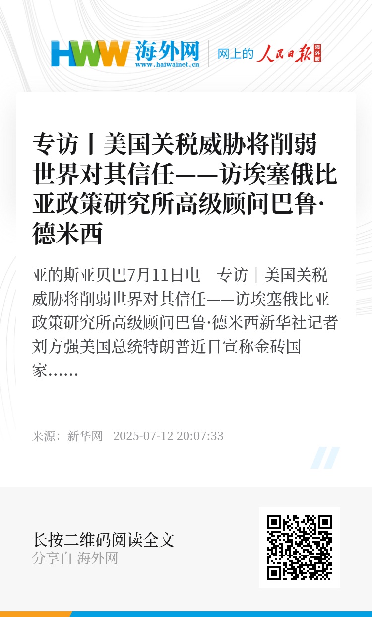 新华社亚的斯亚贝巴7月11日电 专访|美国关税威胁将削弱世界对其信任——访埃塞俄比亚政策研究所高级顾问巴鲁·德米西