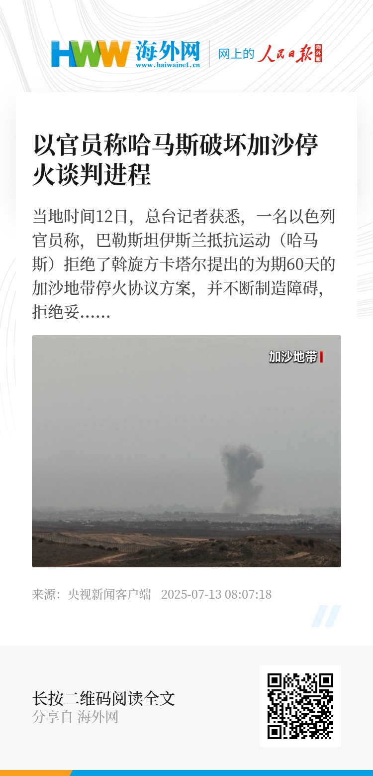 当地时间12日,总台记者获悉,一名以色列官员称,巴勒斯坦伊斯兰抵抗运动(哈马斯)拒绝了斡旋方卡塔尔提出的为期60天的加沙地带停火协议方案,并不断制造障碍,拒绝妥协,破坏谈判进程。