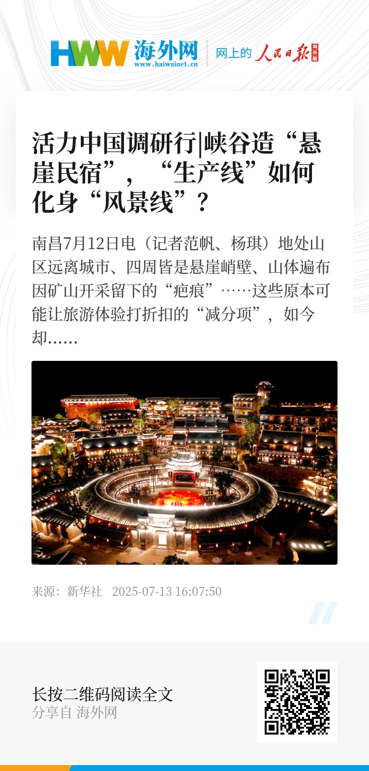 新华社南昌7月12日电(记者范帆、杨琪)地处山区远离城市、四周皆是悬崖峭壁、山体遍布因矿山开采留下的“疤痕”……这些原本可能让旅游体验打折扣的“减分项”,如今却成了让望仙谷景区爆火的“加分项”。景区去年接待游客310万人次,单日最高峰有3.3万名游客涌入,全年实现旅游收入5.28亿元。