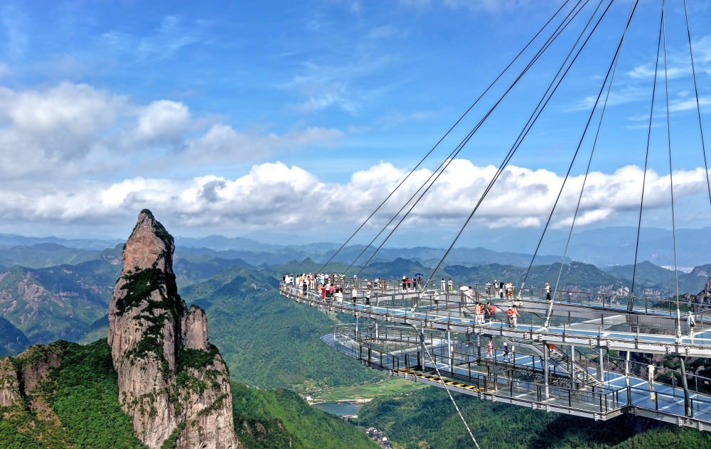 7月5日,游客在浙江省台州市仙居县神仙居景区南天顶玻璃观景台上游玩(无人机照片)。新华社发(王华斌 摄)