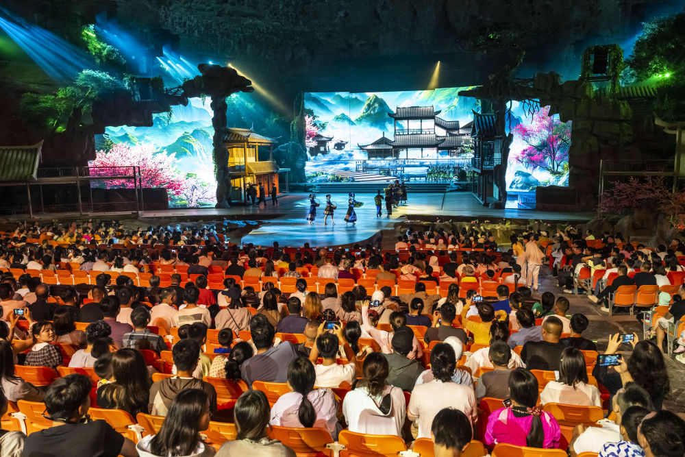 7月10日,游客在利川市腾龙洞的洞穴内观看实景剧《夷水丽川》。新华社发(郑家裕 摄)