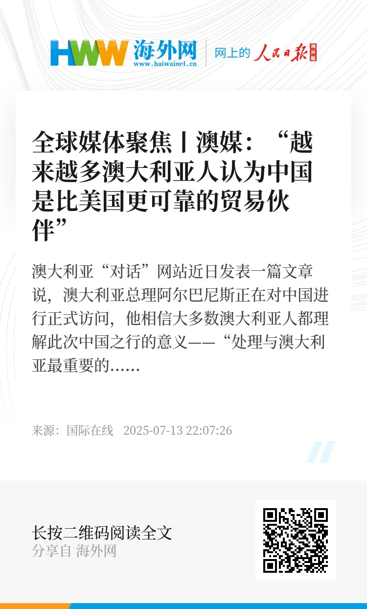 文章说,阿尔巴尼斯已经明确表示,他对中国的访问将以经贸为重点。去年澳大利亚对华出口额高达1960亿澳元(约合9200亿元人民币),超过了排在中国之后的四大市场的总和。与此同时,中国也是澳大利亚的最大进口来源地,这有效降低了澳大利亚民众的生活成本。根据澳大利亚中国工商业委员会委托科廷大学开展的研究显示,对华贸易使澳大利亚普通家庭可支配收入增加了2600澳元(约合1.2万元人民币),人均提升幅度达4.6%。