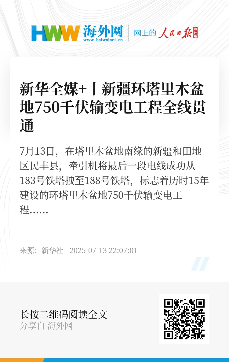 7月13日,在塔里木盆地南缘的新疆和田地区民丰县,牵引机将最后一段电线成功从183号铁塔拽至188号铁塔,标志着历时15年建设的环塔里木盆地750千伏输变电工程全线贯通。