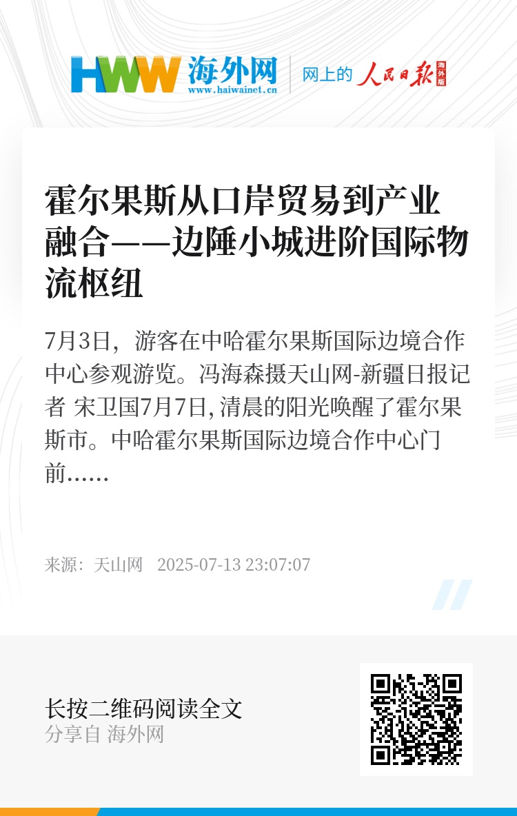 7月7日,清晨的阳光唤醒了霍尔果斯市。中哈霍尔果斯国际边境合作中心门前排起了长长的队伍;霍尔果斯陆港国际贸易有限公司货场里,一辆辆来自中亚各国的车辆正在等待装货;城市道路更是热闹起来,世界各地的游客、商人行色匆匆,奔向各自的目的地。
