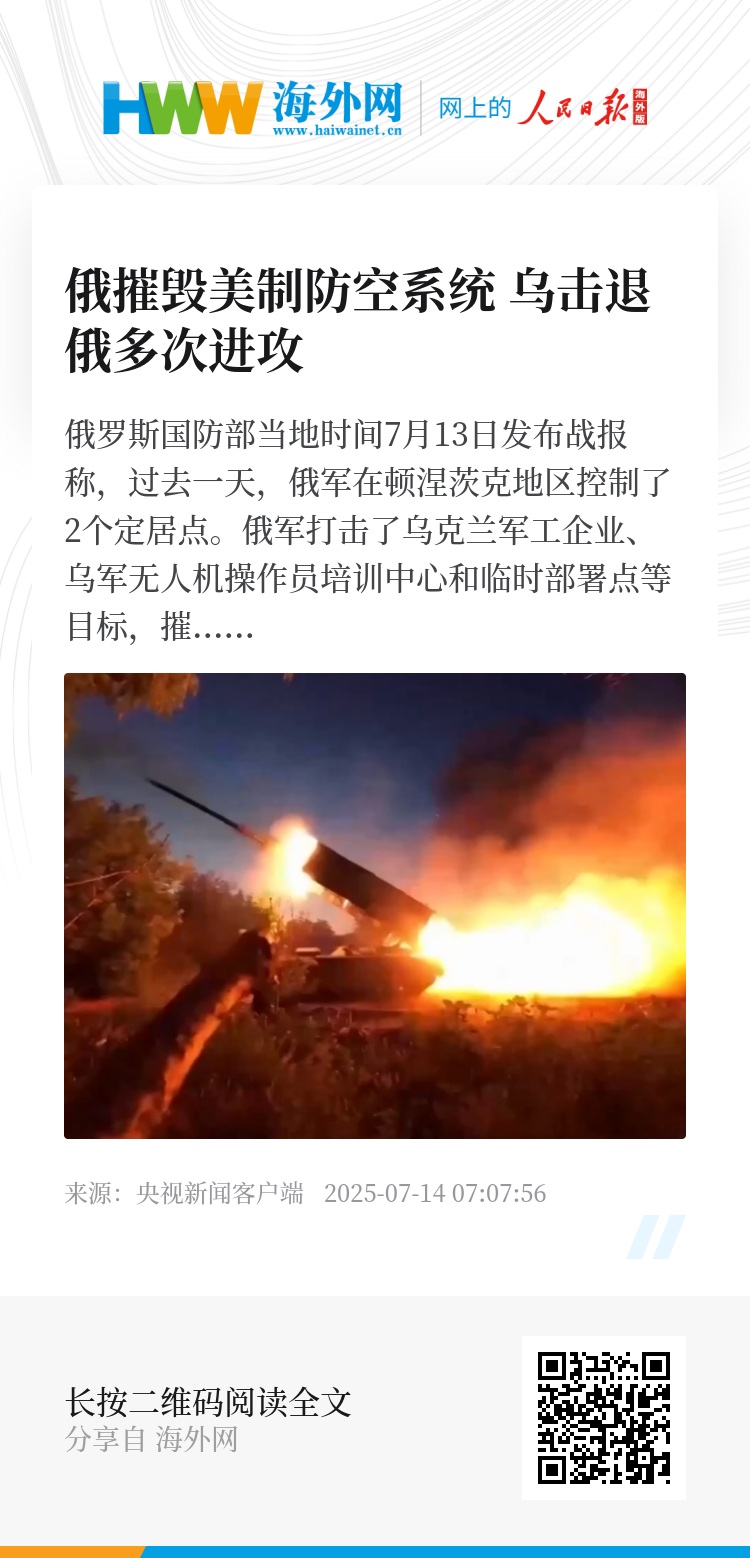 俄罗斯国防部当地时间7月13日发布战报称,过去一天,俄军在顿涅茨克地区控制了2个定居点。俄军打击了乌克兰军工企业、乌军无人机操作员培训中心和临时部署点等目标,摧毁美制“爱国者”防空系统的2套发射装置和1座雷达站。俄军防空系统则摧毁了乌军9枚航空炸弹和215架无人机。