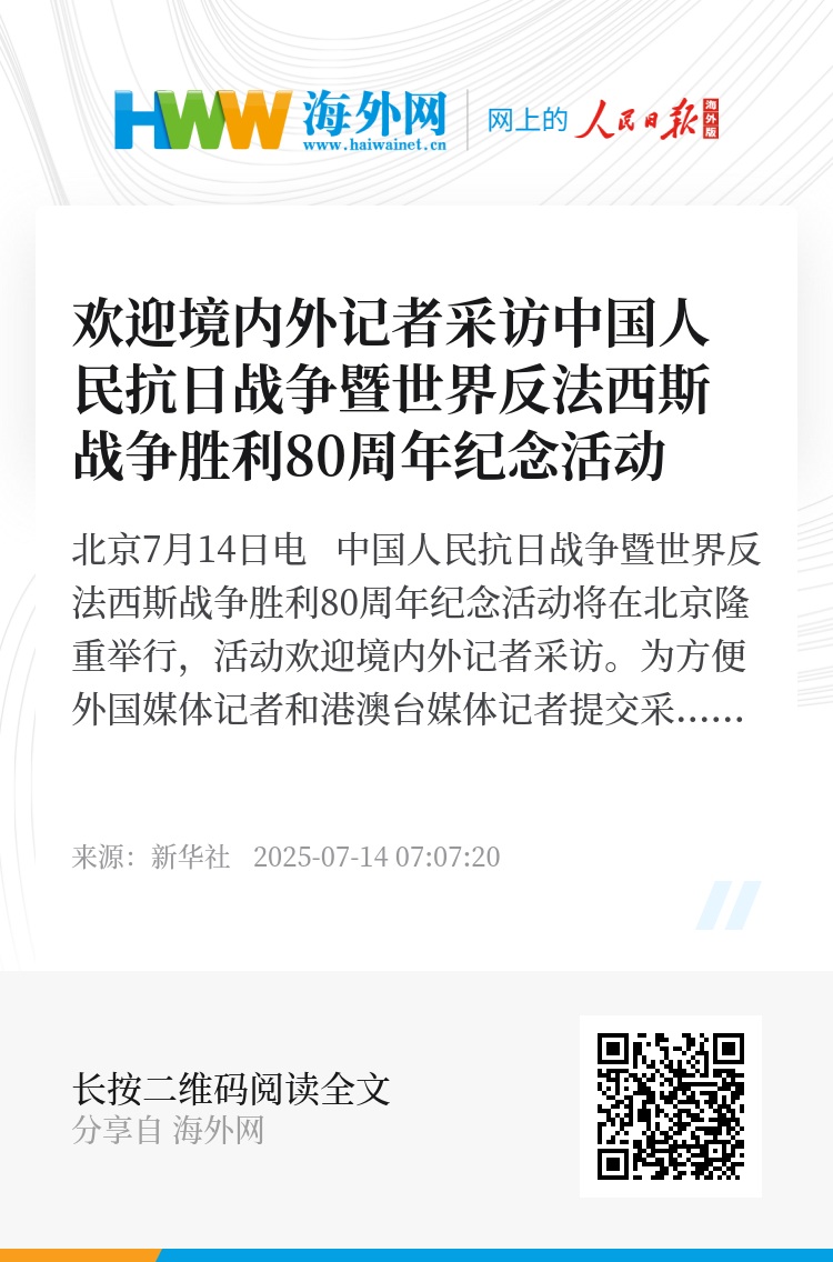 新华社北京7月14日电 中国人民抗日战争暨世界反法西斯战争胜利80周年纪念活动将在北京隆重举行,活动欢迎境内外记者采访。