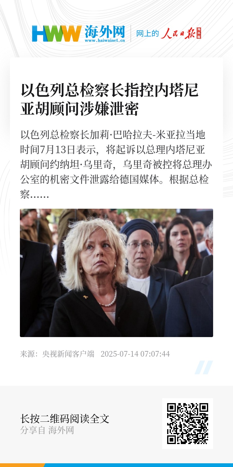 以色列总检察长加莉·巴哈拉夫-米亚拉当地时间7月13日表示,将起诉以总理内塔尼亚胡顾问约纳坦·乌里奇,乌里奇被控将总理办公室的机密文件泄露给德国媒体。