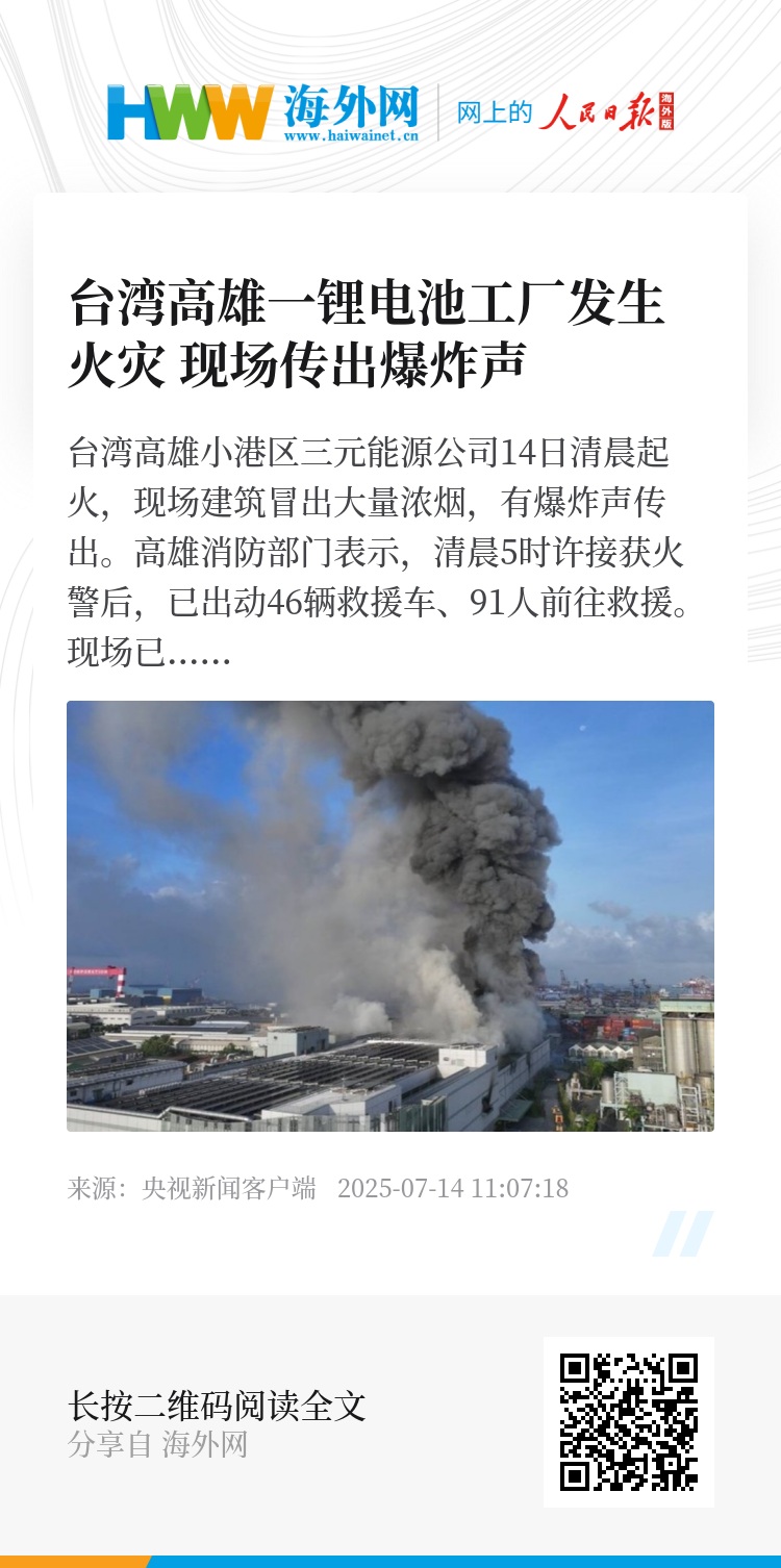 据悉,该公司邻近高雄小港机场。小港机场方面回应称,火灾未对航班起降造成影响。