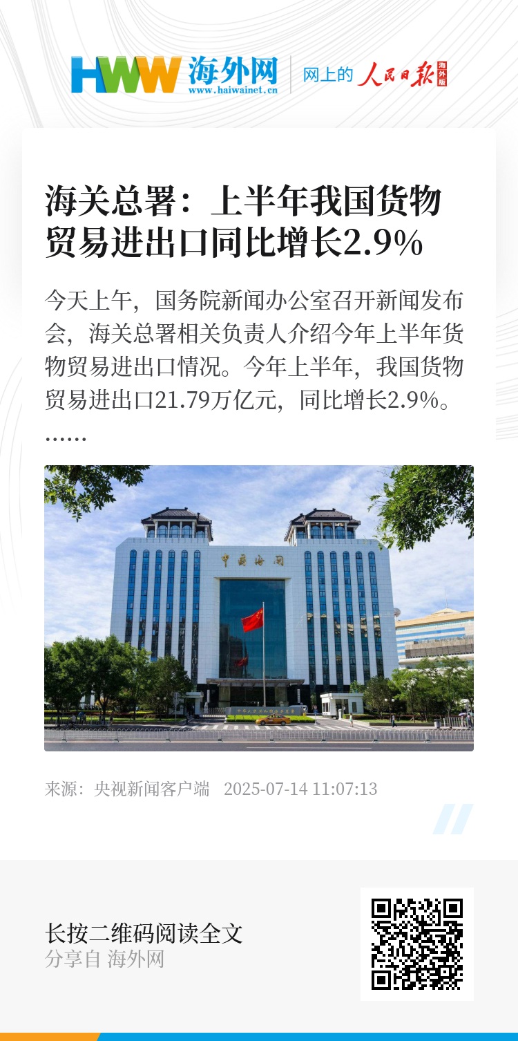 今天上午,国务院新闻办公室召开新闻发布会,海关总署相关负责人介绍今年上半年货物贸易进出口情况。今年上半年,我国货物贸易进出口21.79万亿元,同比增长2.9%。今年以来,面对复杂严峻的国际形势,我国外贸保持较强韧性,实现总量增长、质量提升、变量可控。