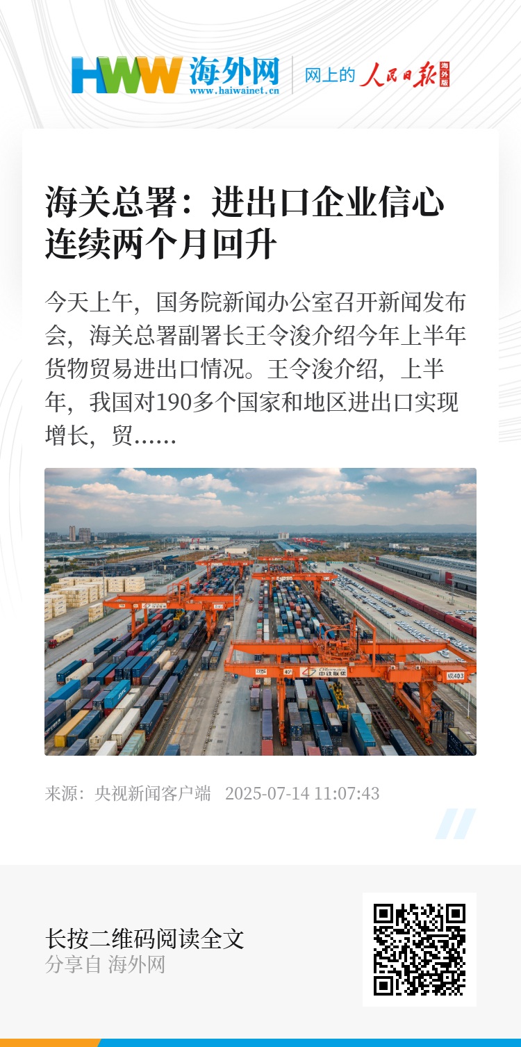 王令浚介绍,上半年,我国对190多个国家和地区进出口实现增长,贸易规模超过500亿元的伙伴数量达到61个,比去年同期增加了5个。在对欧盟、日本、英国等传统市场实现增长的同时,新兴市场贡献了更多的增量,上半年对非洲进出口1.18万亿元,增长14.4%,对中亚进出口3572亿元,增长13.8%。“爬坡过坎,关键是提振信心”。最新一期中国海关贸易景气调查结果显示,出口企业和进口企业信心都连续两个月回升。