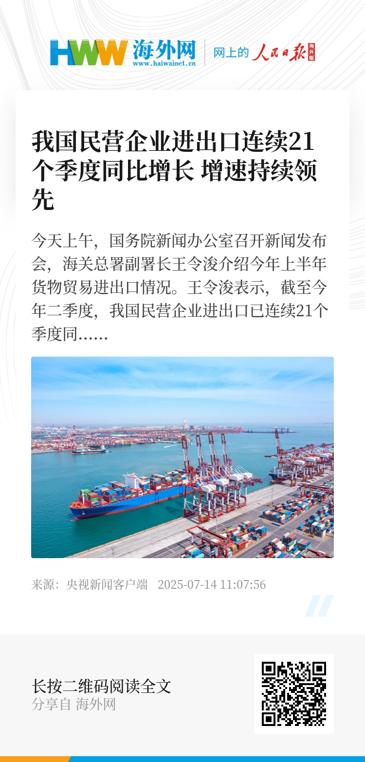 王令浚表示,截至今年二季度,我国民营企业进出口已连续21个季度同比增长,增速持续领先。今年上半年,我国民营企业进出口12.48万亿元,同比增长7.3%,占我国外贸比重达57.3%,较去年同期提升2.3个百分点。其中出口、进口均实现增长。