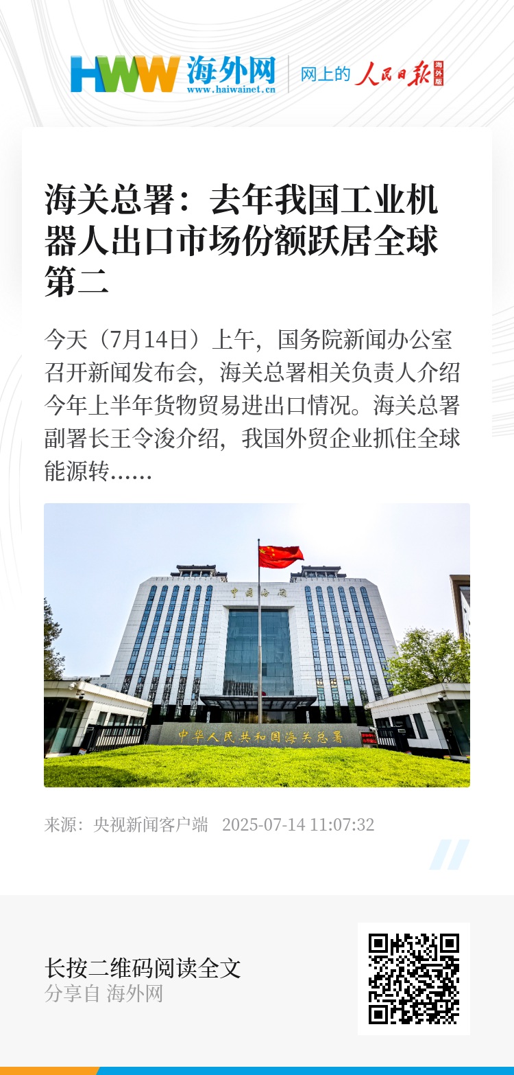 海关总署副署长王令浚介绍,我国外贸企业抓住全球能源转型新趋势,持续增加优质绿色产品供给,加速开辟新领域、新赛道。上半年,锂电池、风力发电机组出口增速都超过两成。最近大家可能都在关注“机超”,也就是机器人足球赛,从跳舞到马拉松再到踢足球,机器人越来越多才多艺,充分体现了我国机器人产业的创新活力。去年我国工业机器人出口市场份额跃居全球第二,今年上半年出口继续增长61.5%。烹调、清洁、送餐、娱乐等机器人越来越智能,为全球消费者生活带来更多便利。