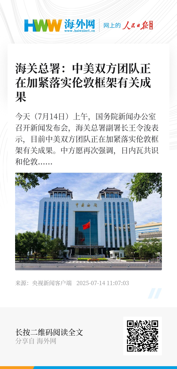 今天(7月14日)上午,国务院新闻办公室召开新闻发布会,海关总署副署长王令浚表示,目前中美双方团队正在加紧落实伦敦框架有关成果。中方愿再次强调,日内瓦共识和伦敦框架来之不易,讹诈胁迫没有出路,对话合作才是正道。希望美方继续同中方相向而行,让合作成为中美经贸的主旋律,推动全球贸易体系重回公平与开放的轨道,为全球经济复苏和增长作出应有的贡献。
